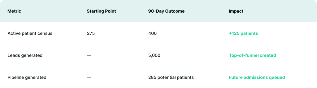 Bottom line: ScaleCare drove meaningful census growth fast and created a large forward pipeline so Pristine didn’t have to chase thousands of unqualified leads.